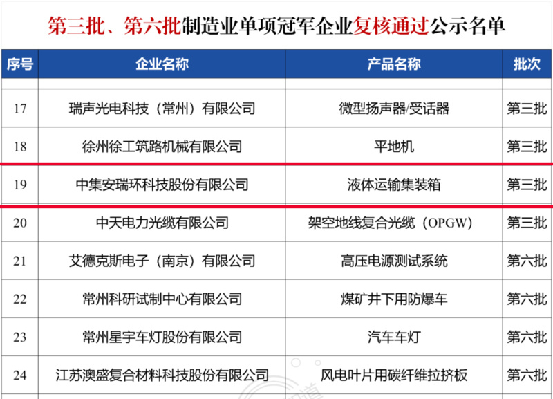 近日,江蘇省工信廳公示第九批國家級制造業(yè)單項冠軍企業(yè)及第三批、第六批復核通過名單,中集安瑞環(huán)科技股份有限公司(簡稱 “中集環(huán)科”)憑借在液體罐式集裝箱領域的持續(xù)領跑優(yōu)勢,成功通過復核,再次蟬聯(lián) “制造業(yè)單項冠軍示范企業(yè)” 稱號。這一結(jié)果不僅是對企業(yè)長期專注細分市場的肯定,更印證了其在技術創(chuàng)新、市場競爭力等核心維度的行業(yè)標桿地位。?
