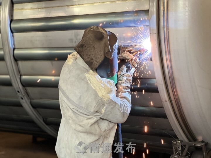 1日,記者走進中集安瑞環(huán)科技股份有限公司(以下簡稱“中集環(huán)科”)生產車間,切身感受一線職工在高溫酷暑季節(jié)的作業(yè)環(huán)境。公司訂單飽滿,生產線馬力全開,工作人員有條不紊地忙碌著。令人印象頗深的是,公司自動化生產線和裝備的投入使用,極大改善了員工的作業(yè)環(huán)境,減輕了人員勞動強度,這也是中集環(huán)科發(fā)展新質生產力的生動實踐。早上6點,公司標罐車間十字焊接工李忠付開始今天的工作,中午12點便可下班。今年開始,公司明文規(guī)定要錯開高溫時間段生產,保障員工在高溫天氣下的安全與健康?!爱敋鉁剡_到37攝氏度以上,我們下午都是不上班的。”2007年加入中集環(huán)科,李忠付已經是一名老師傅,只見他麻利地穿好牛皮防護服、防護手套,戴上焊工防護面罩后,還會把提供涼氣的“空調衣”準備好,一系列操作行云流水,他開始將加熱管和加強圈陸續(xù)焊接到罐體上。
